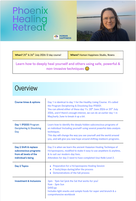 Where: Human Happiness Training Room, Nowra NSW